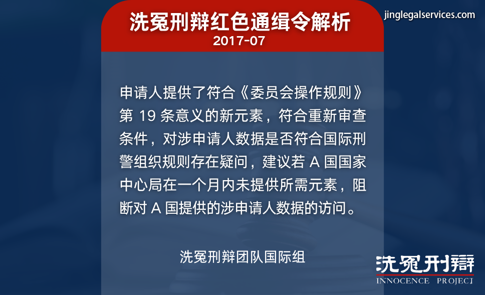 申请人提供了符合《委员会操作规则》第 19 条意义的新元素,符合重新审查条件,对涉申请人数据是否符合国际刑警组织规则存在疑问,建议若 A 国国家中心局在一个月内未提供所需元素,阻断对 A 国提供的涉申请人数据的访问。...
