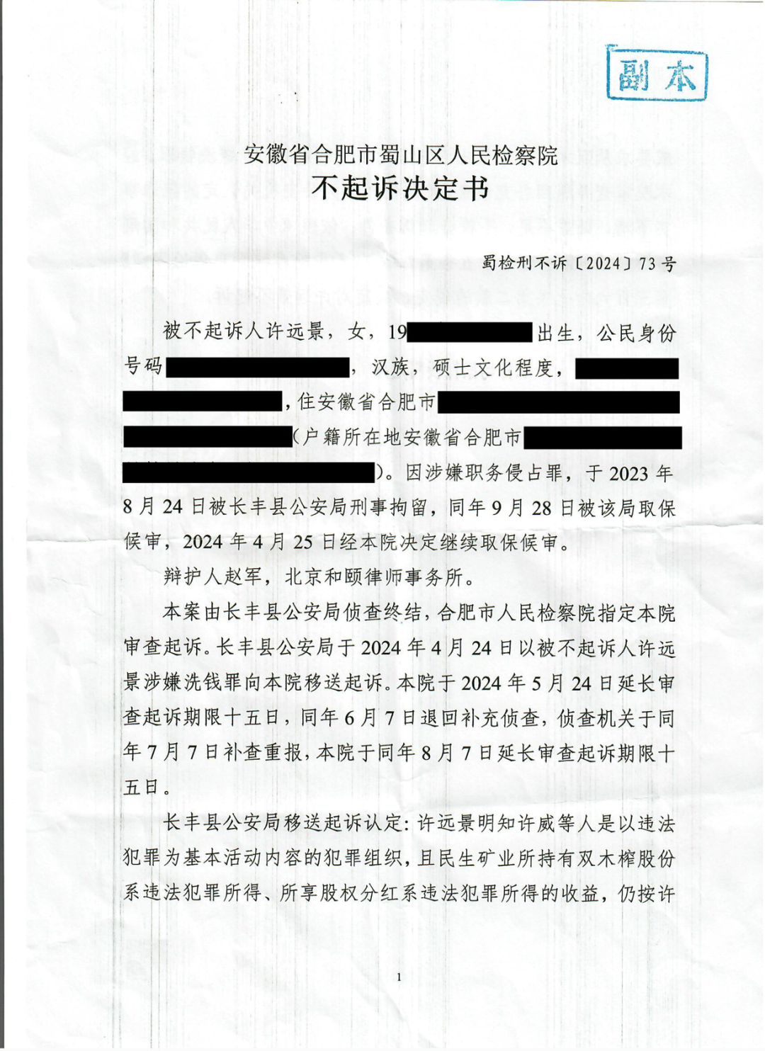 近日,洗冤刑辩团队辩护的合肥许威涉黑案中当事人许远景被指控职务侵占、挪用资金、洗钱罪一案,合肥市蜀山区人民检察院作出不起诉决定,该案是洗冤刑辩团队收获的第45起